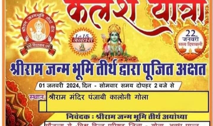 आगामी 01 जनवरी विश्व हिंदू परिषद एवं राष्ट्रीय स्वमं सेवक संघ के तत्वाधान में श्री राम मंदिर अयोध्या 22 जनवरी प्राण प्रतिष्ठा कार्यक्रम के पूर्व छोटी काशी गोला नगर में पंजाबी कालोनी स्थित श्री राम मंदिर में रामचरित मानस का अखण्ड पाठ दिनांक 31 दिसंबर समापन 1 जनवरी एवं उसी दिन मानस पाठ के उपरांत राम मंदिर पंजाबी कालोनी से एक भव्य शोभा यात्रा जिसमे श्री राम मंदिर पूजित अक्षत होगा ! जो श्री राम मंदिर पंजाबी कालोनी से प्रारंभ होकर नगर के मुख्य मार्गों से होकर गुजरेगी , जिसमें आप सभी 01 जनवरी को अपरान्ह 1.30 बजे पंजाबी कालोनी राम मंदिर में अधिक से अधिक संख्या से सम्मिलित होकर यात्रा की शोभा बढ़ाने के साथ श्री राम का आशीर्वाद प्राप्त करें ! 14 वर्ष बाद जब श्री राम अयोध्या लौटे थे तब उत्सव मनाया गया था परंतु इस बार 500 वर्ष बाद लौट रहे है तो अब हमे महा उत्सव मानना है ! जय श्री राम 🛕❣️#RamMandirAyodhya। नि- #विश्वहिंदूपरिषद गोला गोकरण नाथ लखीमपुर खीरी 9450502310