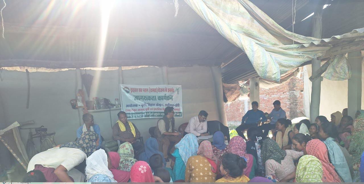 *कुकरा-खीरी।* चंद्रशेखर आजाद कृषि एवं प्रौद्योगिकी विश्वविद्यालय, कानपुर द्वारा संचालित कृषि विज्ञान केंद्र जमुनाबाद, लखीमपुर खीरी द्वारा जनजातीय गौरव वर्ष पखवाड़ा के अंतर्गत खीरी जिले के पलिया विकासखंड के गांव बुद्धापुरवा में थारू जनजातीय समुदाय के त्वरित एवं सतत उत्थान के लिए जागरूकता कार्यक्रम का आयोजन हुआ जिसमें केंद्र के सस्य वैज्ञानिक डॉ० प्रदीप कुमार बिसेन ने किसानों को कृषि, पशुपालन और औद्यानिक फसलों की आधुनिक वैज्ञानिक तकनीकी विधि से खेती करने जिससे उत्पादन लागत में गुणवत्तापूर्ण अच्छा उत्पादन प्राप्त करने की जानकारी दी। उद्यान वैज्ञानिक डॉ० मोहम्मद सुहैल ने किचेन गार्डन में बोई गई सब्जियों का अवलोकन कर जैविक आधारित और रबी की फसलों की तकनीकी जानकारी दी। डॉ० सुहैल ने पालक, मूली, सोया, धनिया, गाजर आदि की उन्नतशील उत्पादन तकनीक के विषय में विस्तार पूर्वक जानकारी दी। वैज्ञानिक पशुपालन डॉ० एन० के० त्रिपाठी ने उद्यमिता और विभिन्न उत्पादों के विपणन की आधुनिक तकनीक और पशुपालन और दुग्ध व्यवसाय के बारे में ग्रामीणों को तकनीकी जानकारी दी। कार्यक्रम में विभिन्न व्यवसाय कर रहे ग्रामीणों ने उत्साहपूर्वक प्रतिभाग कर महत्वपूर्ण जानकारी प्राप्त की ।