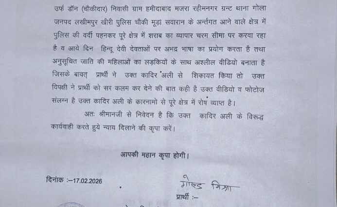 गोला कोतवाली क्षेत्र की मूड़ा सवारान चौकी के अंतर्गत तैनात चौकीदार कादिर अली उर्फ डॉन पर बजंरग दल के मंडल अध्यक्ष गोल्ड मिश्रा ने कई गम्भीर वारदातें को लेकर जिलाधिकारी खीरी को दिया शिकायत पत्र,की कार्यवाही की मांग ।